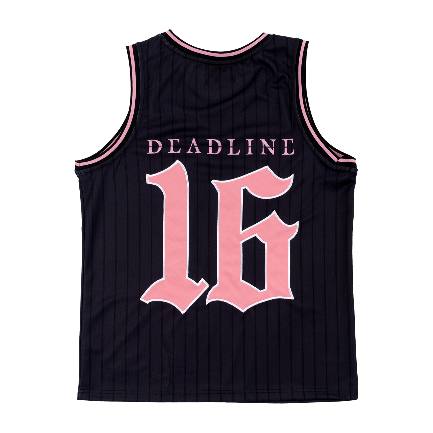 Custom black pinstripe basketball jersey with BLACKPINK on the front and DEADLINE 16 on the back.